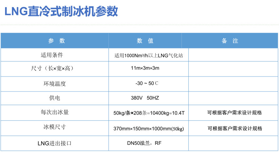 我公司最新研發(fā)生產的新型的LNG直冷式制冰機,可以將LNG中的冷能進行有效利用--制成冰塊,冰塊用于生產和日常生活中,變廢為寶,可獲得可觀的經濟效益。